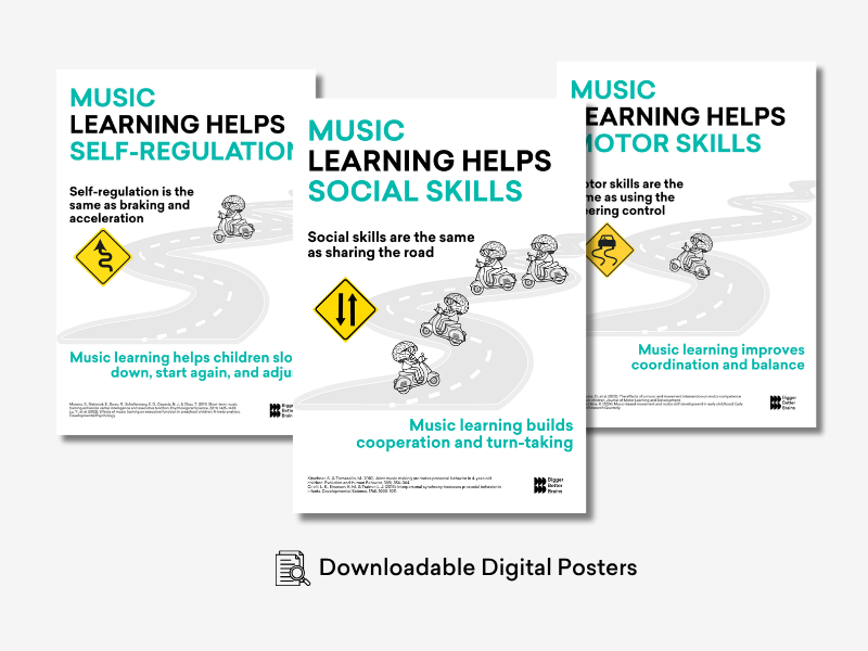 Each poster highlights a key school readiness benefit of music learning, such as attention, motor skills, coordination and cognitive development. Visually engaging and research-informed, these posters are crafted to communicate clearly and impactfully.